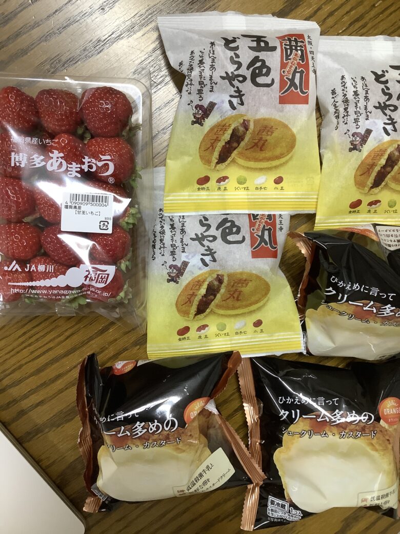 苺、どら焼き、シュークリームをいただきました